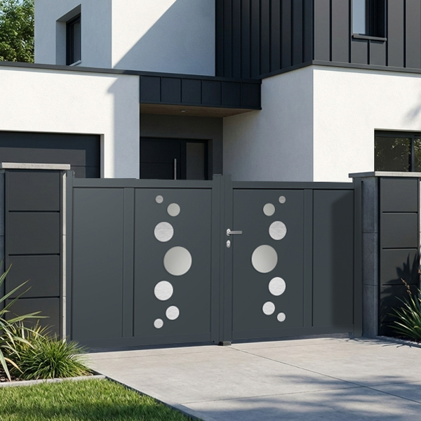 Idéal pour fermer et oculter votre propriété, ce portail aluminium design offre un excellent rapport qualité prix, il allie une grande robustesse et une parfaite tenue dans le temps. Il ne nécessitera aucun entretien et résistera parfaitement aux conditions climatiques les plus défavorables (pluie, gel, neige, soleil...). Composé de profils aluminium thermolaqués et panneaux aluminium double paroi injectés de mousse de polyuréthane 16 mm et bulles inox et verres dépolis, sa durée de vie sera bien supérieur à celle d'un portail pvc ou bois