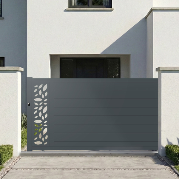 Portail aluminium coulissant semi-modern plein à motif floral Lotus-V