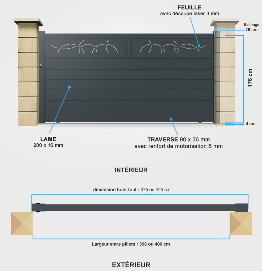 Idéal pour fermer votre propriété, ce portail aluminium coulissant à motifs floral offre un excellent rapport qualité prix, il allie une grande robustesse et une parfaite tenue dans le temps. Il ne nécessitera aucun entretien et résistera parfaitement aux conditions climatiques les plus défavorables (pluie, gel, neige, soleil...). Composé de profils aluminium thermolaqués sablés sa durée de vie sera bien supérieur à celle d'un portail pvc ou bois