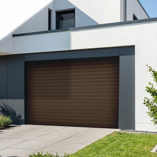 Porte de garage enroulable motorisée marron 8014 à lames de 100 mm x 25 mm
